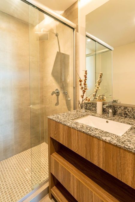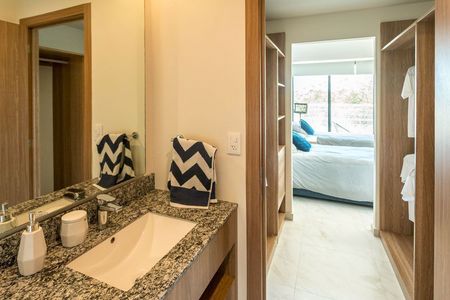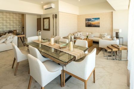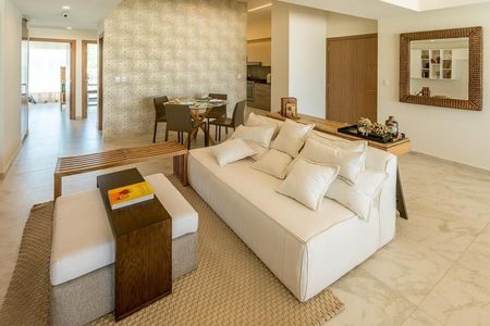 Sala, comedor, cocina con meseta de granito, dos recámaras con closet vestidor, baño y vista a terraza-balcón, recámara, baño, área de lavado con baño, dos cajones de estacionamiento.