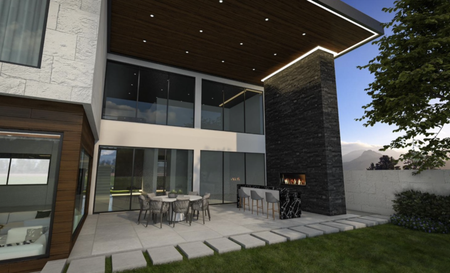 - Fachada con revestimientos cerámicos, piedras naturales y deck sintético.