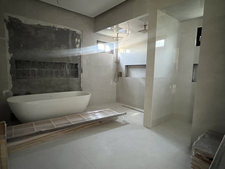 - Baño con regadera, tina, sanitario y doble lavaneta de nogal con cubierta de mármol y espejo panorámico, iluminación.