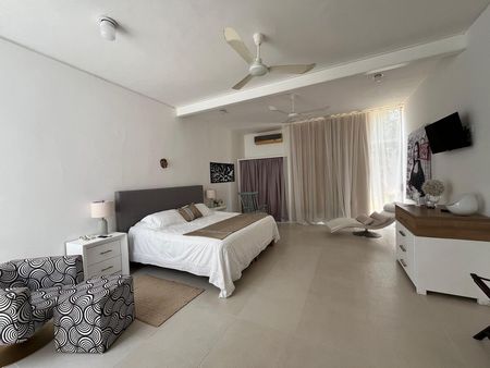 Habitación en planta baja con área de clóset, baño completo y sauna