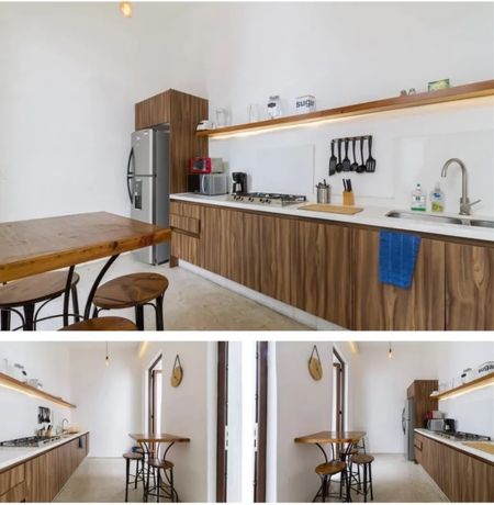 Cocina integral con barra de cuarzo, parrilla eléctrica TEKA, refrigerador MABE.