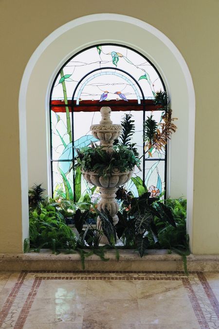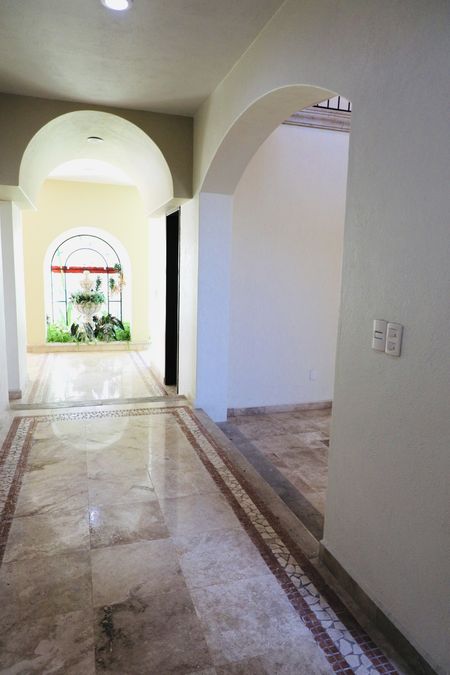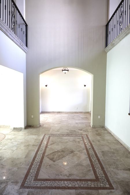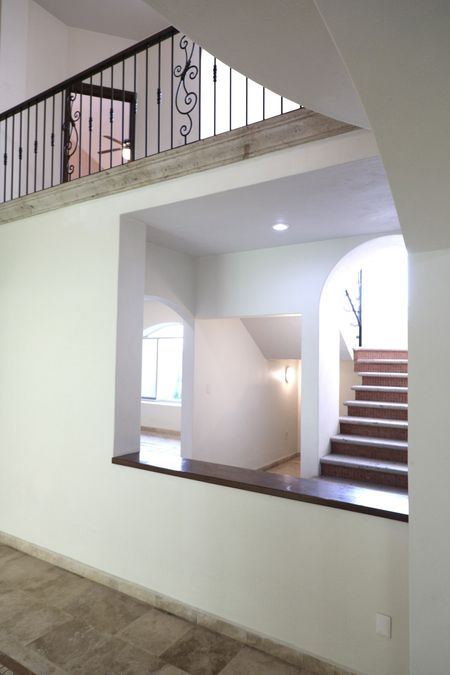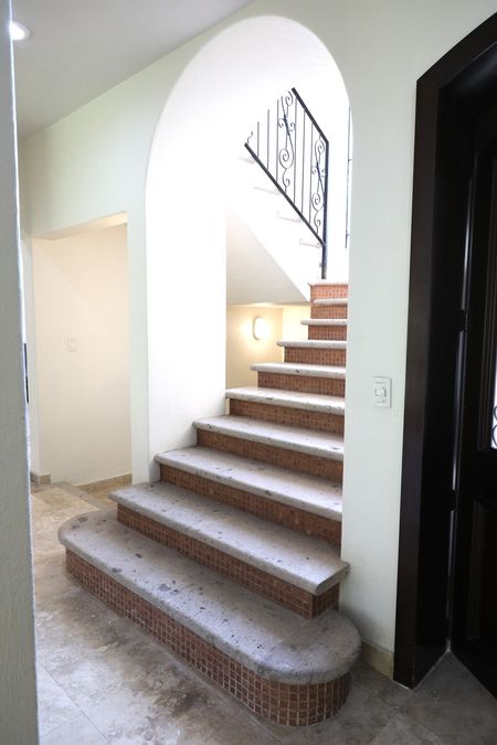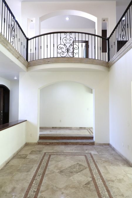 En el interior, la casa ofrece espacios amplios y luminosos, con pisos de mármol en patrones decorativos y techos de doble altura que realzan la amplitud. La escalera de cantera con detalles en mosaico conduce a una planta alta que se asoma a un vestíbulo central, protegido por una balaustrada de herrería artística.