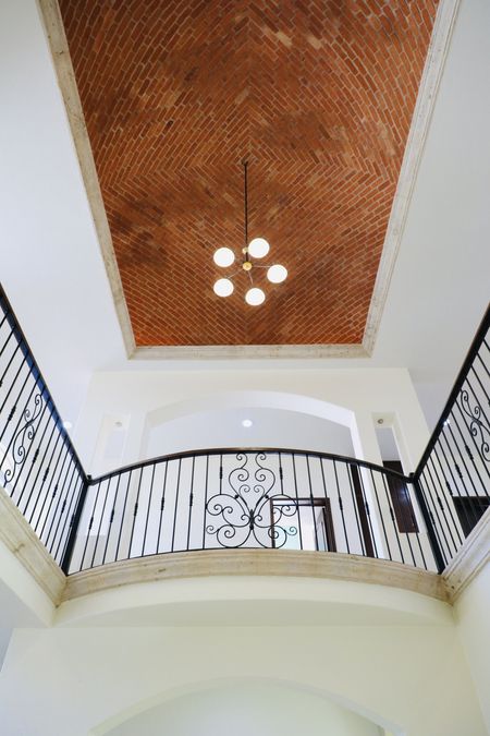 La residencia cuenta con una sala principal de gran altura, coronada por un hermoso techo de bóveda catalana en ladrillo aparente, que se convierte en un punto focal arquitectónico. Varias áreas poseen ventanales de piso a techo que permiten la entrada abundante de luz natural y vistas al jardín.
