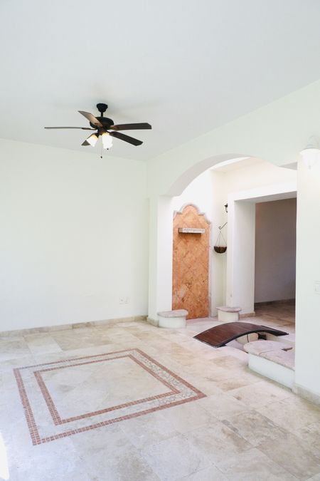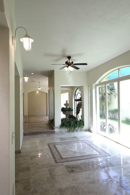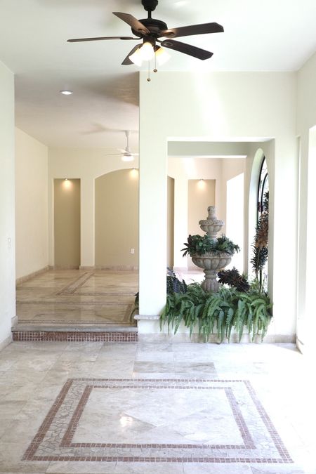 La planta baja integra espacios ideales para recibir visitas o convivir en familia, con detalles como fuentes decorativas, ventiladores de techo y acceso directo a áreas verdes exteriores.