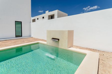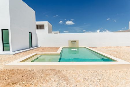 Alberca con acabado chukum, diseño cuadrado con palmeras