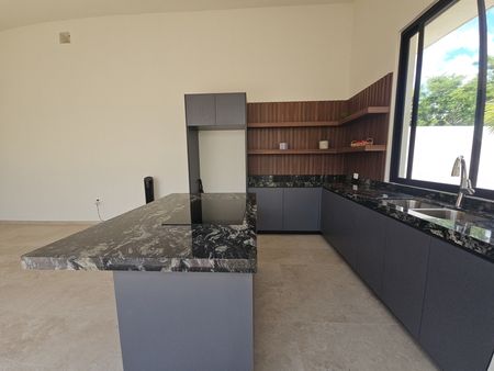 - Cocina, gabinetes inferiores a base de MDF enchapado, doble tarja y parrilla de inducción.