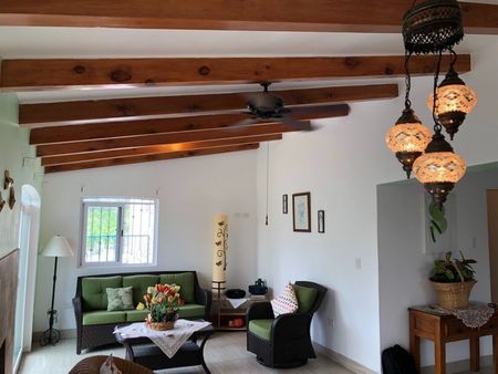 Cocina integral con estufa y campana, closets, puertas y vigas en madera de encino, cancel de baño, lámparas, ventiladores, toldo de poliuretano en la terraza trasera.