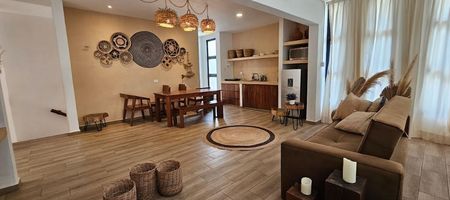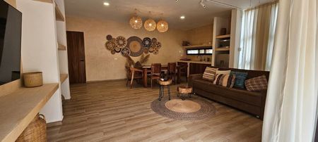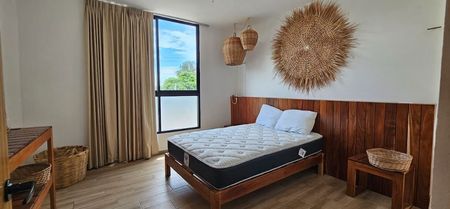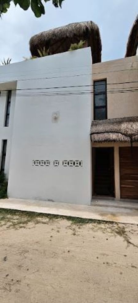 -Terraza techada con palapa de playa, comedor, hamacas y sillas de playa.