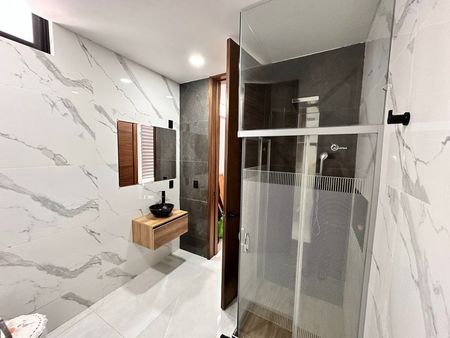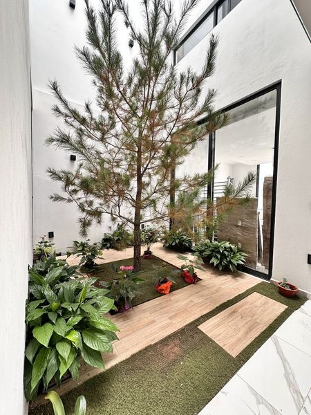 En planta baja cuenta con estancia amplia de sala y comedor, la cual tiene vista al jardin interior de la casa, cocina integral (pendiente por instalar), recamara con baño completo que se comparte con visitas.
