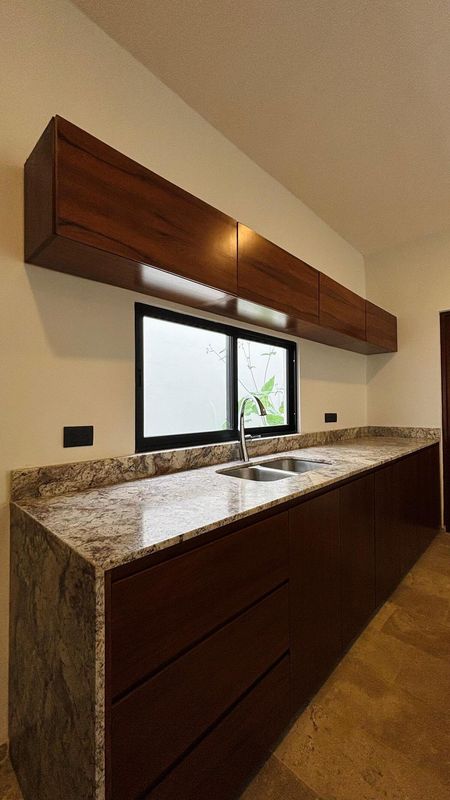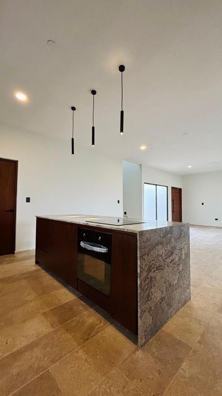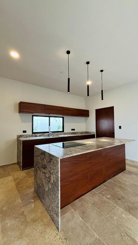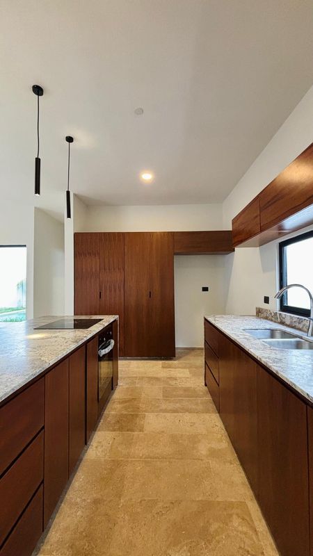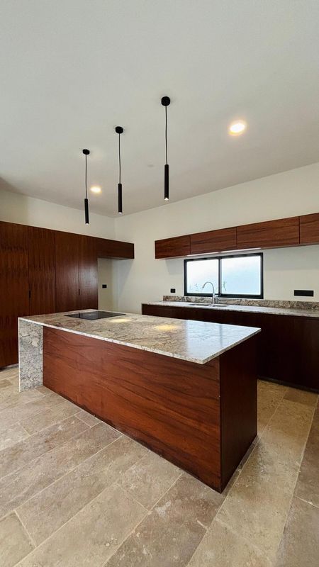 -Cocina integral con isla , parrilla, horno y gavetas de madera.