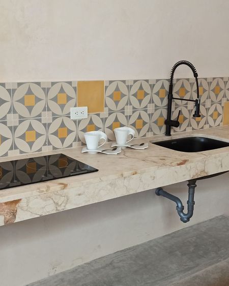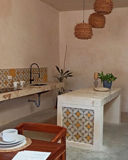 - Cocina funcional y elegante: isla central, mesetas de piedra Macedonia, parrilla de inducción y detalles de loseta artesanal.