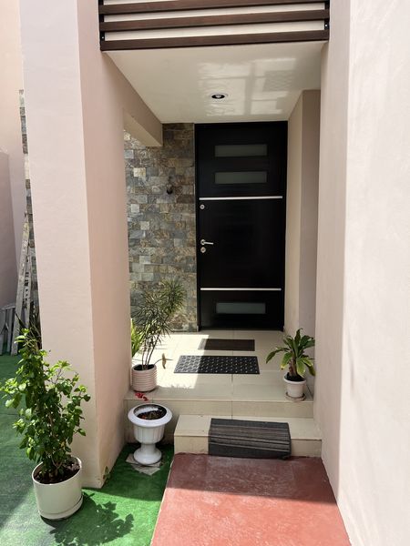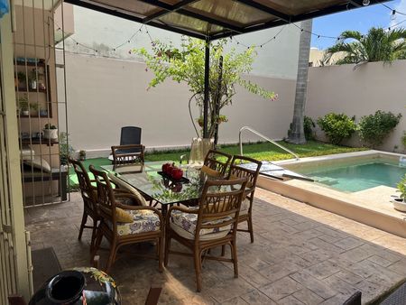 La planta baja tiene garaje para 2 autos, jardín, alberca con baño completo , área de lavado techada, sala/ comedor con aire acondicionado , cocina con barra y medio baño para visitas.