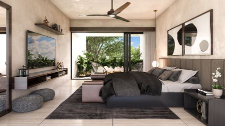 • Recámara principal, con vista al área verde , con balcón, closet vestidor grande, baño completo con dos lavabos.