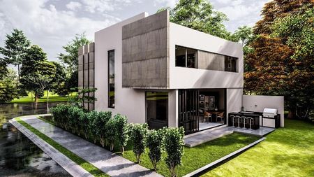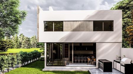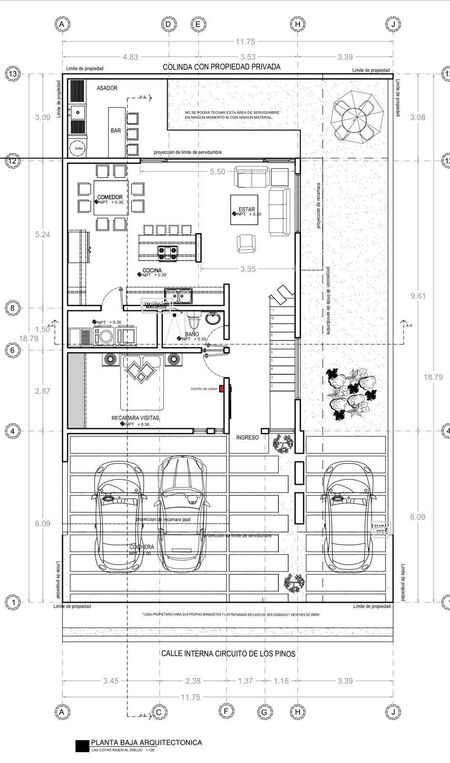 Cochera para 3 autos, ingreso a doble altura, amplia habitación o estudio, baño completo, cocina abierta con isla desayunadora para 4 personas, equipada con torre de hornos, parrilla y campana, cuarto de lavado, espacio de sala y comedor con vista al gran jardín lateral y terraza posterior.