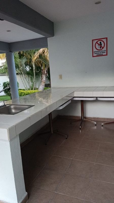 Palapa techada con barra de tarja y mesas que propician un sano esparcimiento al aire libre .