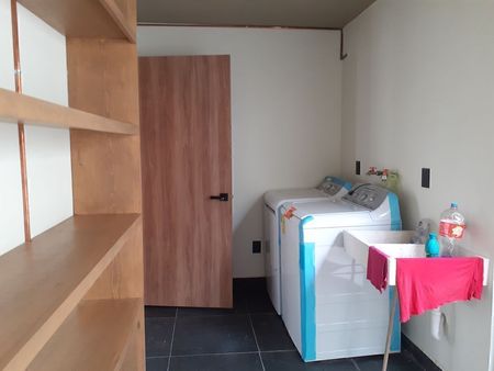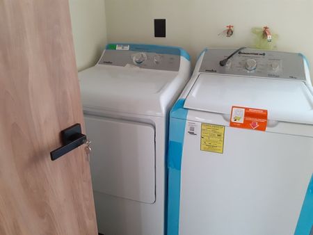 Planta Baja: Sala, comedor con gran ventanal para integrar la terraza, con sala para exterior y barra, cocina con azulejos de moda, estufa con campana-microondas, barra desayunadora, refrigerador, baño de visitas, clóset de visitas, bodega, cuarto de lavado equipado con lavadora y secadora a estrenar, estacionamiento semitechado para 2 autos.
