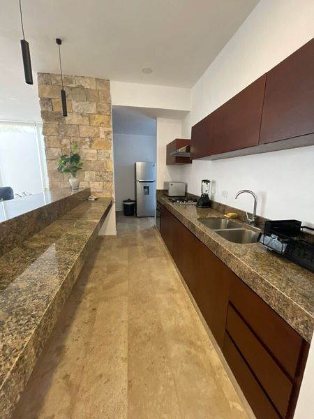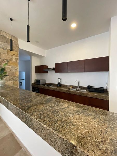 Cocina con barra desayunador, completamente equipada y amueblada