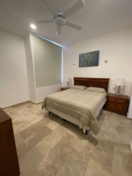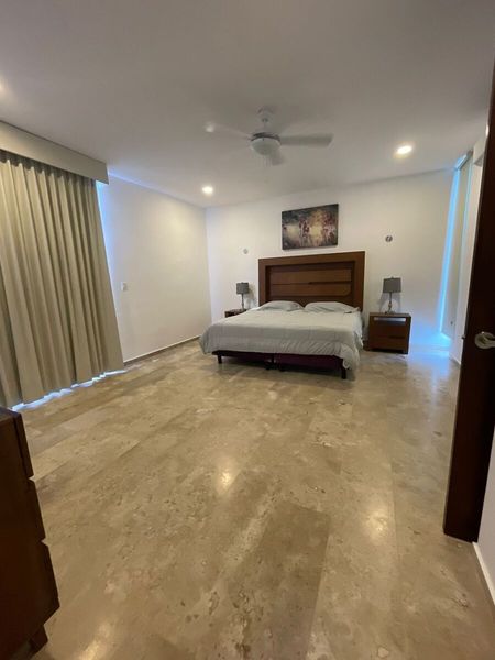 Recamara principal con baño, closet vestidor, aire acondicionado, ventilador y balcón