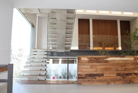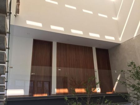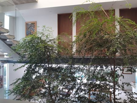 - Recibidor con hermoso muro de piedra y jardín interior con dos árboles naturales.