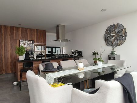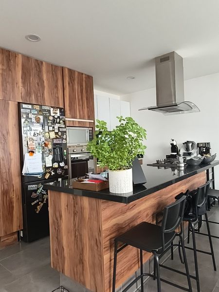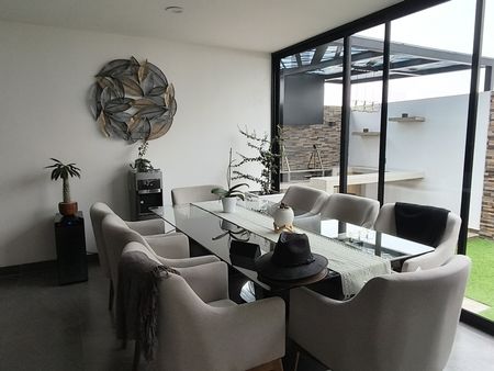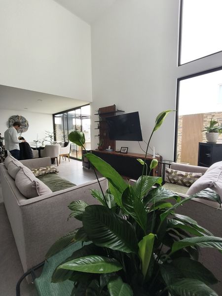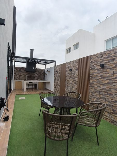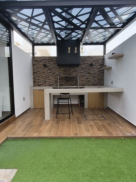 Medio baño, habitación con clóset y baño completo con vista al jardín, sala doble altura, comedor, cocina abierta con isla y barra de granito gris, jardín pasto sintético con iluminación y muro de piedra natural, área de asador con pérgola y cristal templado, barra, campana y asador.