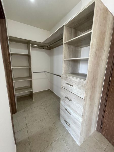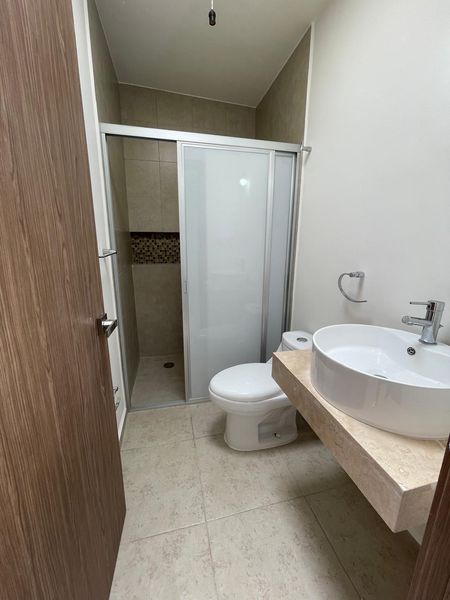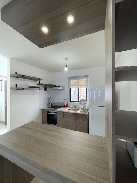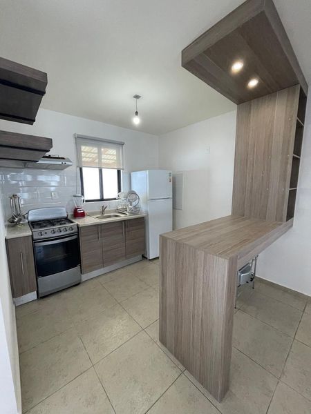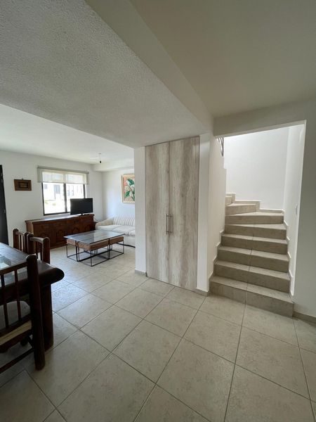 Estacionamiento para dos autos , baño completo en planta baja , sala , comedor , cocina equipada con barra desayunador , terraza, en planta alta 2 habitaciones la secundaria con closet y la principal con baño y closet .