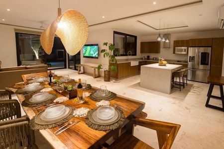 abierta entre el comedor, la cocina y la sala de estar. Este espacio cálidamente decorado invitará a los miembros de