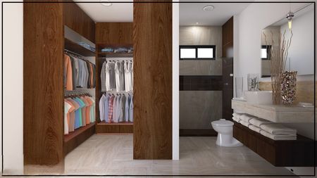 Nicho largo con lambrín de cerámico tipo madera, color oscuro y Lambrín de porcelanato 60x60 Color gris