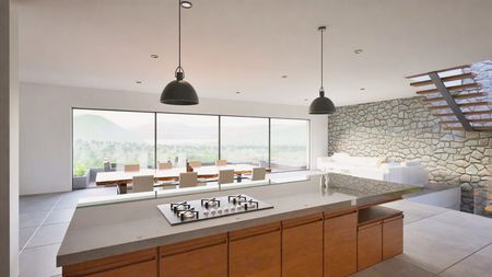 - Cocina equipada con isla central y cubiertas de cuarzo de alta calidad, diseñada para ofrecer funcionalidad y estética.