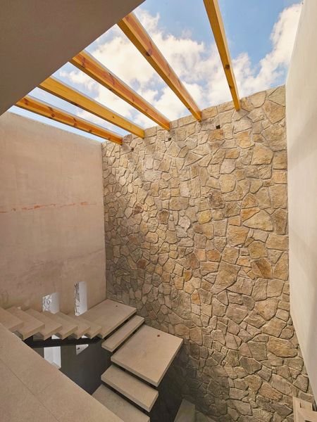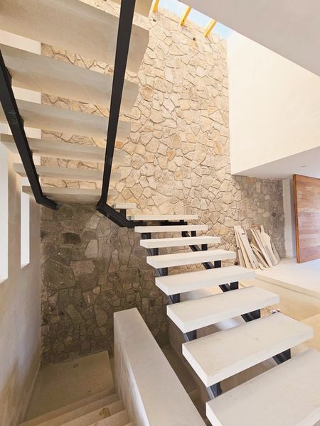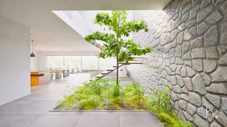 - Doble altura en escaleras con un árbol interno, creando un punto focal natural dentro de la casa.