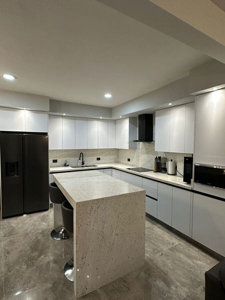 Cocina integral con cubierta e isla de granito y parilla electrica