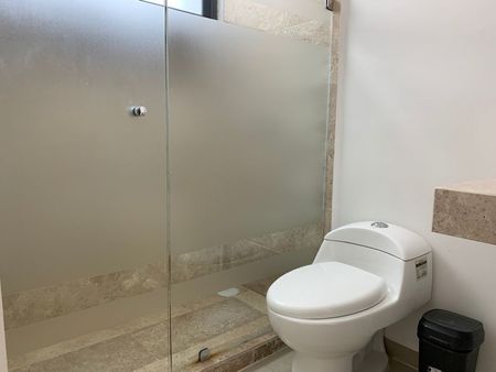 Segunda recámara con baño con cancelería de cristal, mosquiteros y ventilador