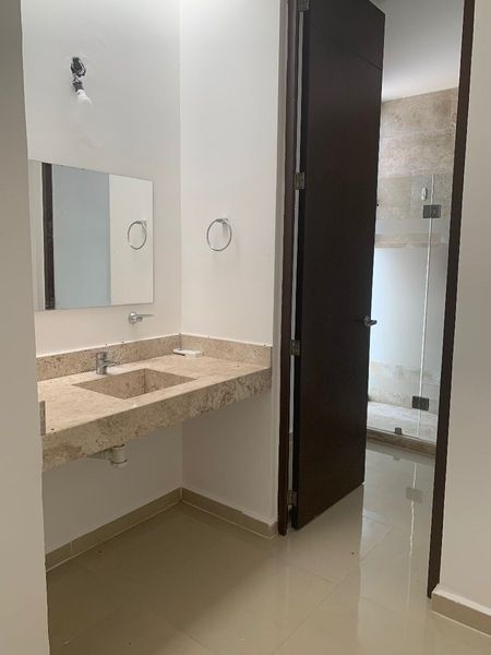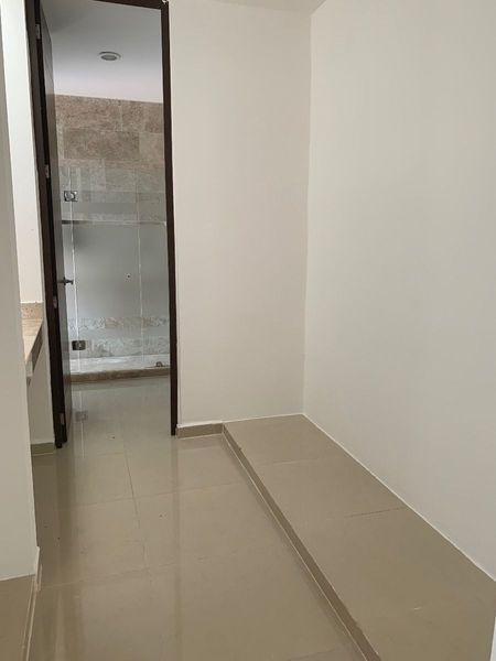 Recámara principal con área de closet-vestidor, baño con cancelería de cristal, aire acondicionado y cortinas y mosquiteros.