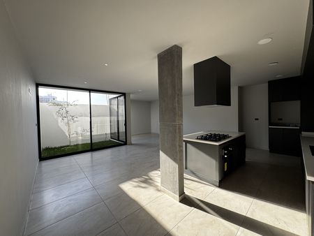 Planta baja: Cochera para 2 autos, pequeño recibidor, medio baño, sala, comedor en concepto abierto, la cocina con barra y jardín.
