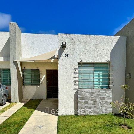Casa de una sola planta con sala–comedor amplia, cocina integral equipada con horno de microondas y estufa, dos recámaras con clósets (la principal con aire acondicionado), un baño completo, patio de servicio con gas estacionario y cochera para un auto.