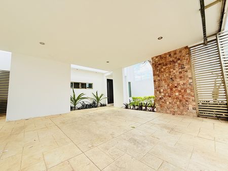 En la , la entrada peatonal y vehicular da acceso a una dos . Desde ahí se ingresa al área social de , integrada con la . En este nivel también se encuentra un ñ y una á ñ , ideal para oficina o estudio y un cuarto de servicio con baño. Afuera, la con cascada, creando un espacio perfecto para convivir.