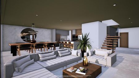 Planta baja: sla, comedor, medio baño de visitas, cuarto de lavado, cuarto de servicio, cocina integral, alacena, bodega y estacionamiento techado para 3 autos.