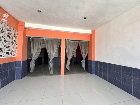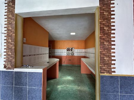 En la parte de enfrente tiene amplio espacio para poner mesas, cuenta con dos cocinas ( una a la vista del público y otra guardada que es donde se ponían los hornos), tiene medio baño para clientes, en la parte de atrás cuenta con una amplia habitación y un baño completo, cuenta con un amplio patio con árboles frutales.