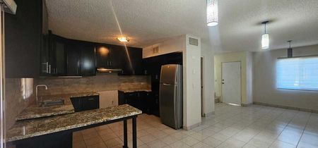 Cocina integral con cubierta de granito,,refrigerador y campana.
