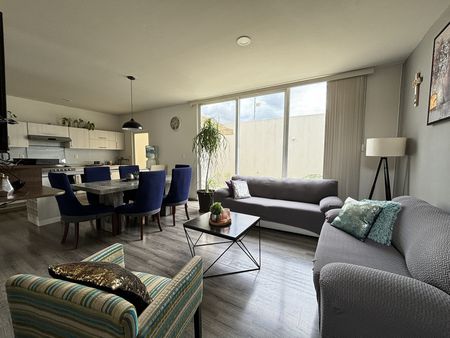 Planta baja: Sala-comedor con vista al jardín, cocina integral con barra desayunadora, Hall de TV, baño completo, área de lavado semi techada, cuenta con 2 pequeñas bodegas baja las escaleras y estacionamiento para 2 autos.