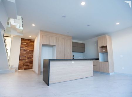 Cochera 2 autos, 1/2 baño, amplia sala comedor y cocina con alacena, área de lavado techado y oculto.