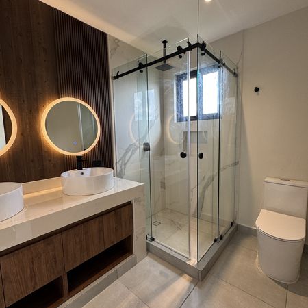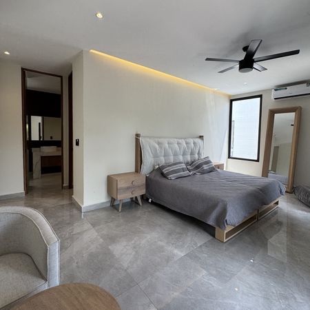 -Habitación principal con balcón, closet vestidor y baño completo con 2 lavabos.