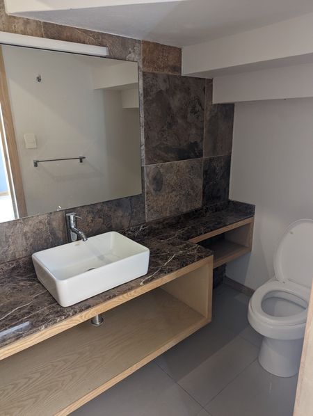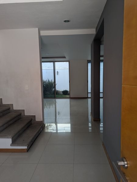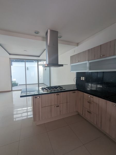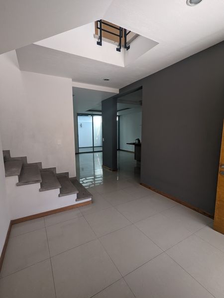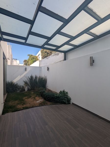 Cuenta con cochera para dos autos, al ingreso estudio y distribuidor con baño completo,bodega bajo escalera,amplia sala con barra y comedor, cocina integral con cubierta de granito y barra, cuarto de servicio, al fondo terraza con jardín.