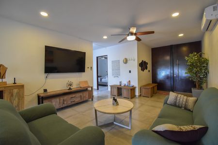 Sala de TV/distribuidor: sillón para 3 personas, 2 muebles, planta decorativa, aire acondicionado y ventilador de techo.