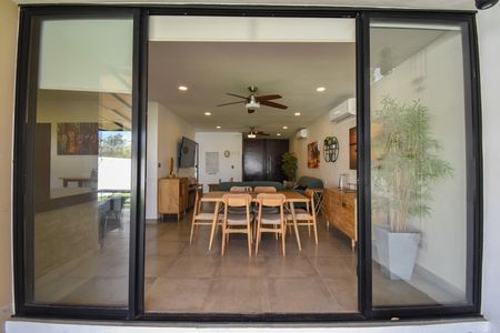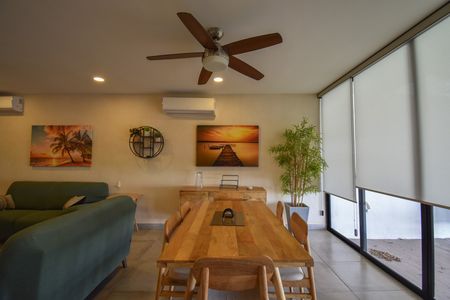 Sala con 2 sillones, mesa central, TV, mueble para TV, mueble tipo bar, comedor para 6 personas, credenza, 2 aires acondicionados (sala-comedor), persianas en ventanales.