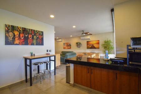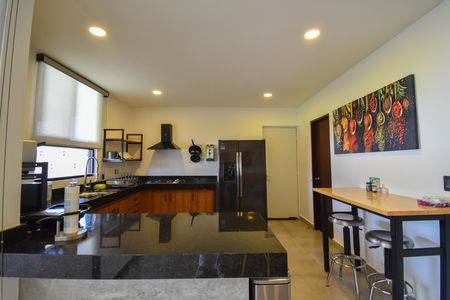 Cocina con barra, mesa con dos bancos, gavetas inferiores, estante superior, tarja doble, estufa Teka de 4 quemadores, campana Supra, refrigerador GE duplex.