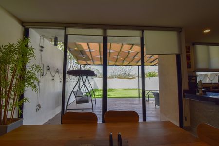 Terraza con piso cerámico tipo madera, techada con estructura de herrería y maya sombra.