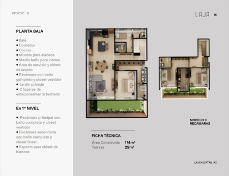 Laja es un complejo de 10,000 m2 integrado por 56 casas de dos modelos distintos, cada uno de dos pisos con elegantes y cómodas amenidades, en una de las zonas con mayor crecimiento y plusvalía de Mérida.