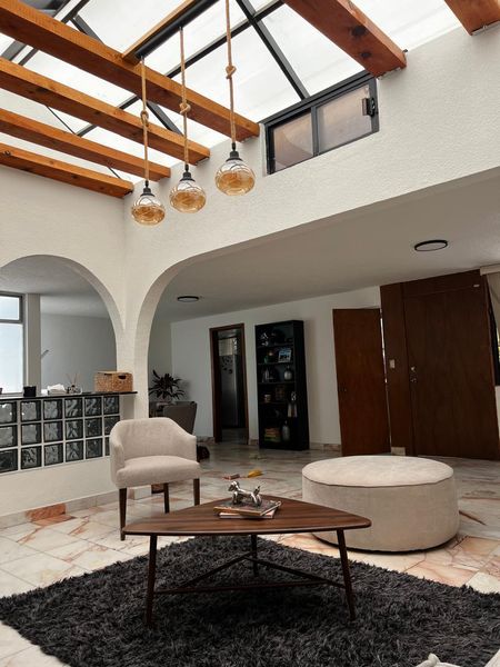 Una puerta grande da entrada a este Bello hogar. Donde sala grande recibe, invitando a conversar, chimenea de diseño cosmopolita de forma contigua, su comedor y mucho espacio para convivir y celebrar su vida, Gran domo tragaluz, envigado tipo pergola.