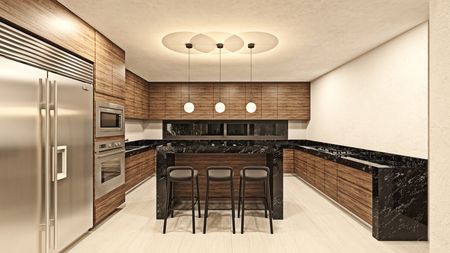- Cocina privada, equipada con meseta de granito, isla central, estufa, gavetas en madera de parata, horno y microondas.