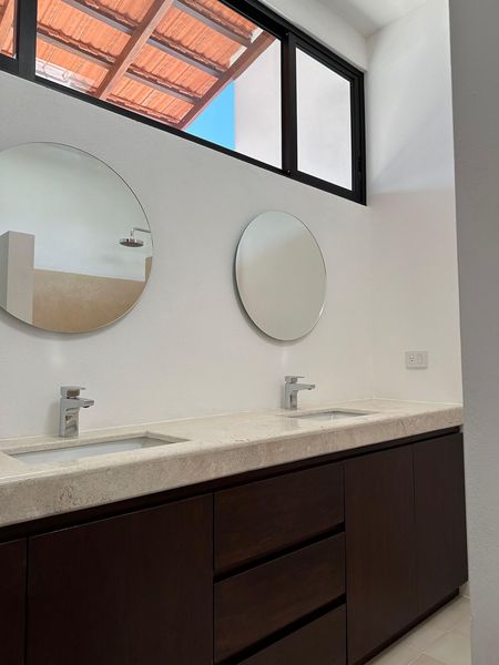 Canceleria de cristal templado en baños. Tejaban en cada habitacion superior con pergola en madera de zapote con teja francesa y terraza privada.